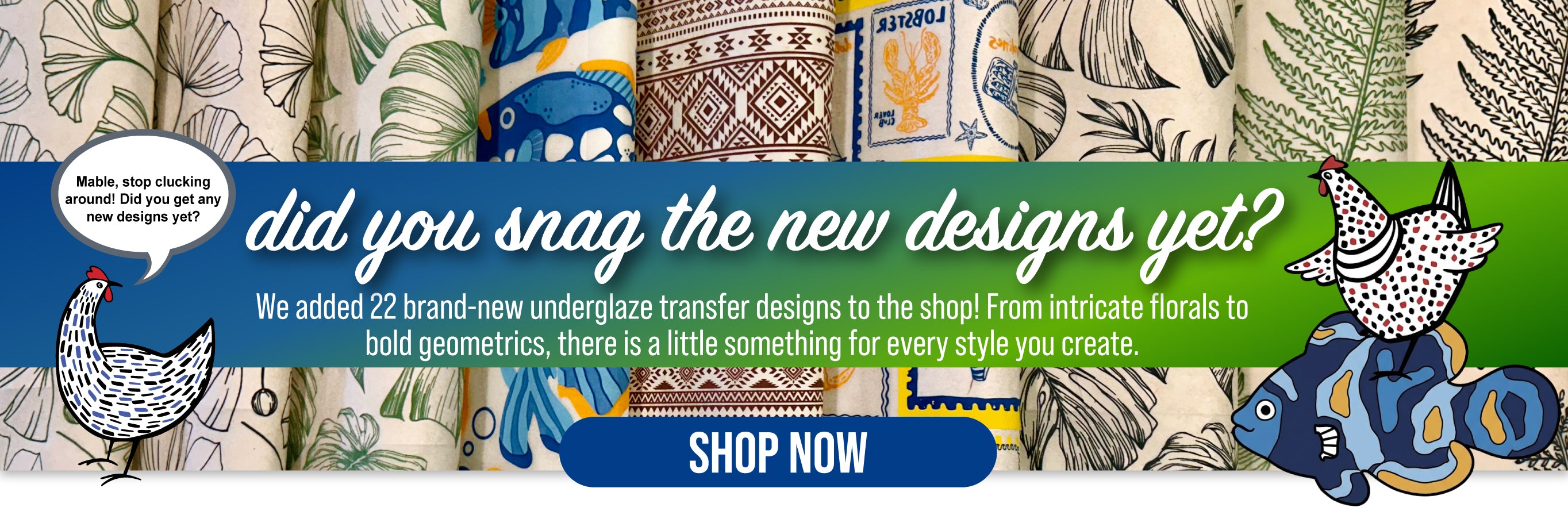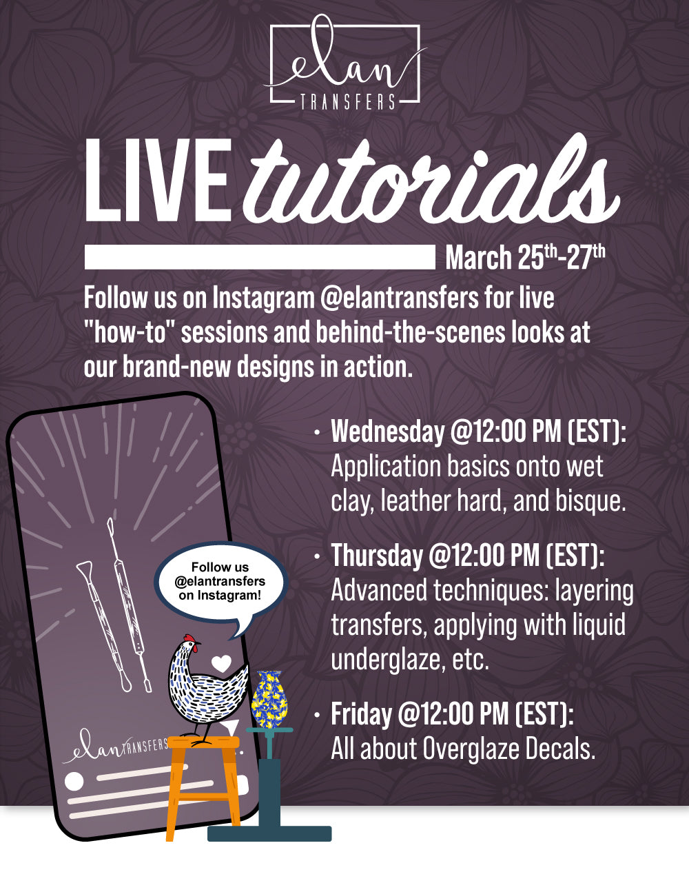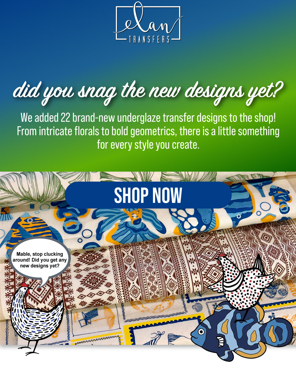 Elan Transfers offers a vibrant collection of high-quality, artist-designed underglaze decals created specifically for today’s ceramic artists. After years of using custom decal designs on her own work, artist Leigh Anne Thompson, saw that there was a need for a fresh approach to a timeless art of underglaze transfers.